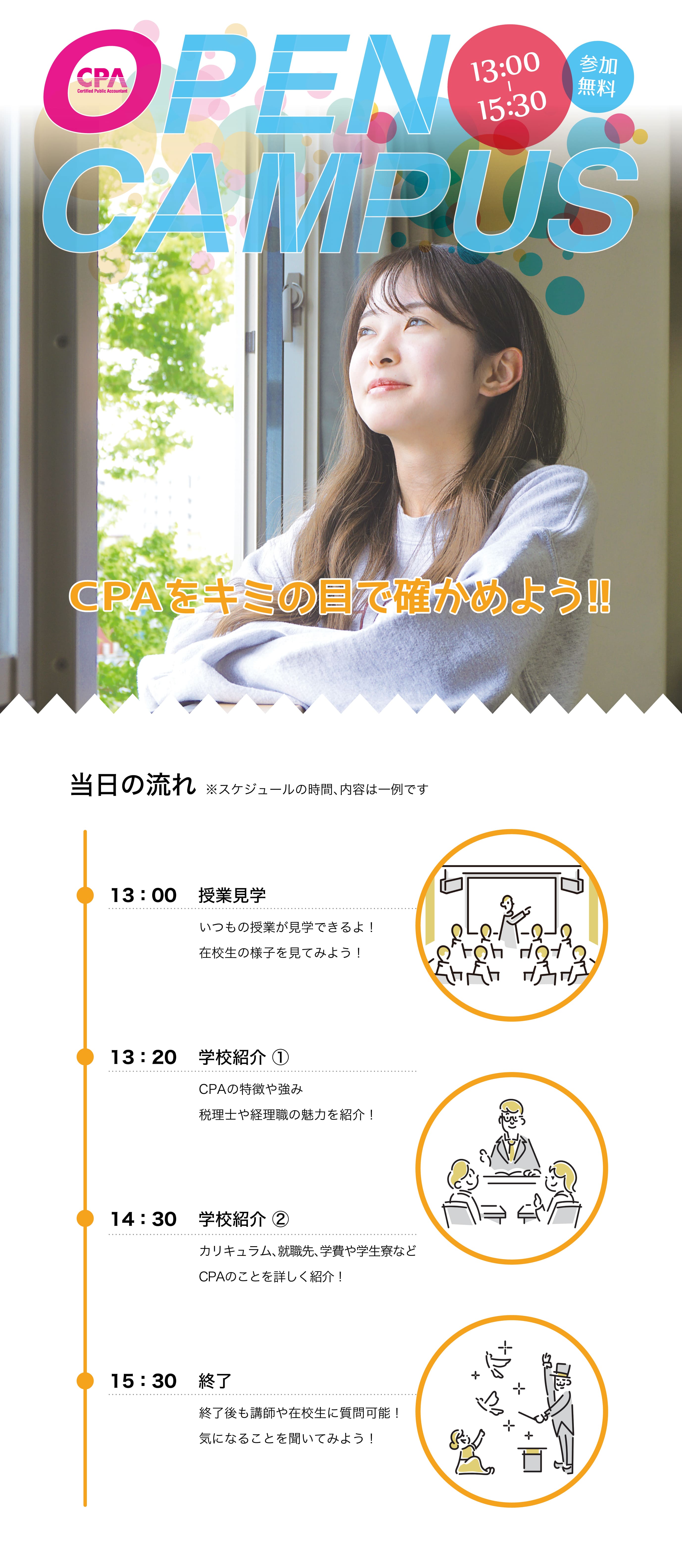 CPAのイベントは、一般的なオープンキャンパスや体験入学のように脚色されたものとは異なり、在学生の実際の授業状況を見学することができます。他とは違うCPAの学習スタイルを実感していただき、入学後のビジョンをより具体的に描くことができます。 是非、ご両親やご友人をお誘いの上、ご来校下さい。