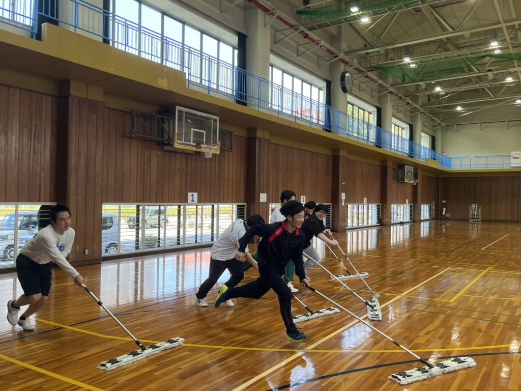 誰がモップをはやく掛けれるか勝負![]()